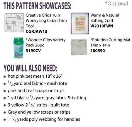 Two Wonky Totes includes instructions to make this tote two different ways. The mesh version features a top facing, the top of the fabric version is bound. Both versions feature a jaunty pocket made with the Creative Grids Wonky Log Cabin Trim Tool. French seams complete the professional look and is a great technique to teach in a class.